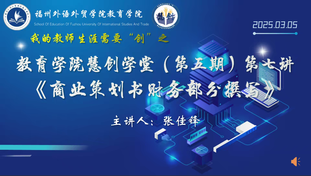 2025年3月5日晚,我院以线上形式开展“我的教师生涯需要‘创’”之教育学院慧创学堂(第五期)第七讲《商业策划书财务部分撰写》。本次课程邀请张佳锋作为主讲,慧创学堂全体学员参会。