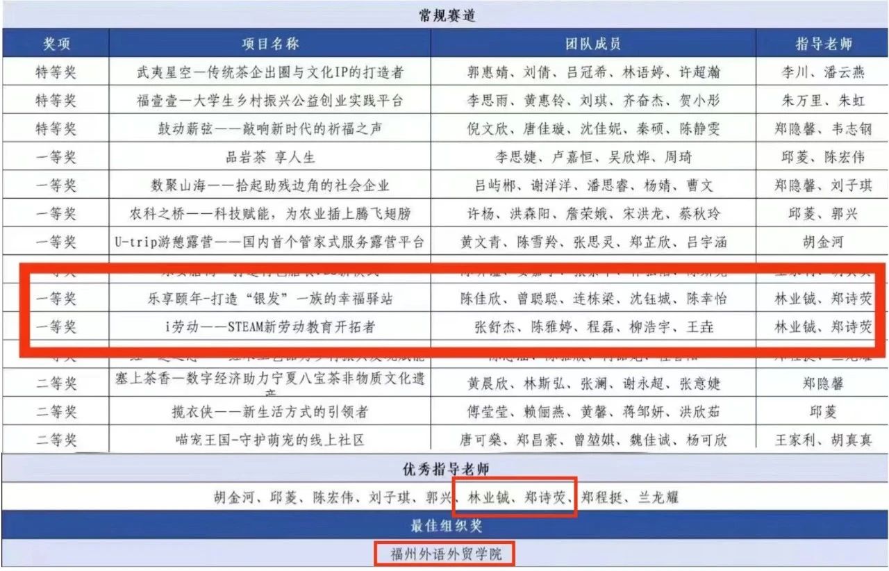 近日,由全国大学生电子商务“创新、创意及创业”挑战赛组委会主办,泉州信息工程学院承办的第十四届三创赛福建赛区选拔赛落下帷幕。我院学生团队入围项目《乐享颐年——打造“银发”一族的幸福驿站》(负责人:陈佳欣,指导老师:林业铖、郑诗荧)和《i劳动——STEAM新劳动教育开拓者》(负责人:张舒杰,指导老师:林业铖、郑诗荧),经过激烈竞争,分别荣获福建省赛一等奖!此外,林业铖、郑诗荧两位老师荣获省级优秀指导老师称号!