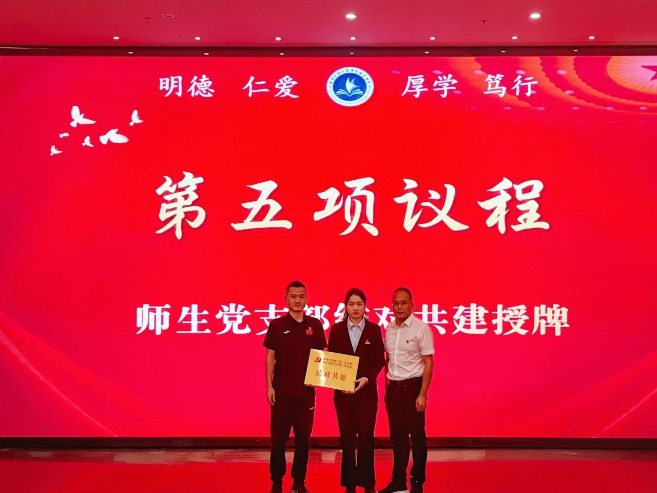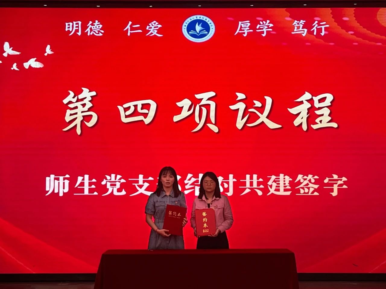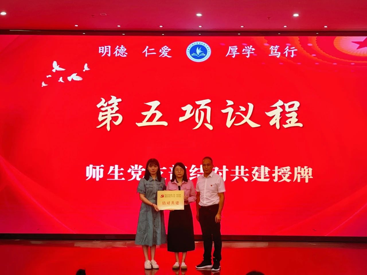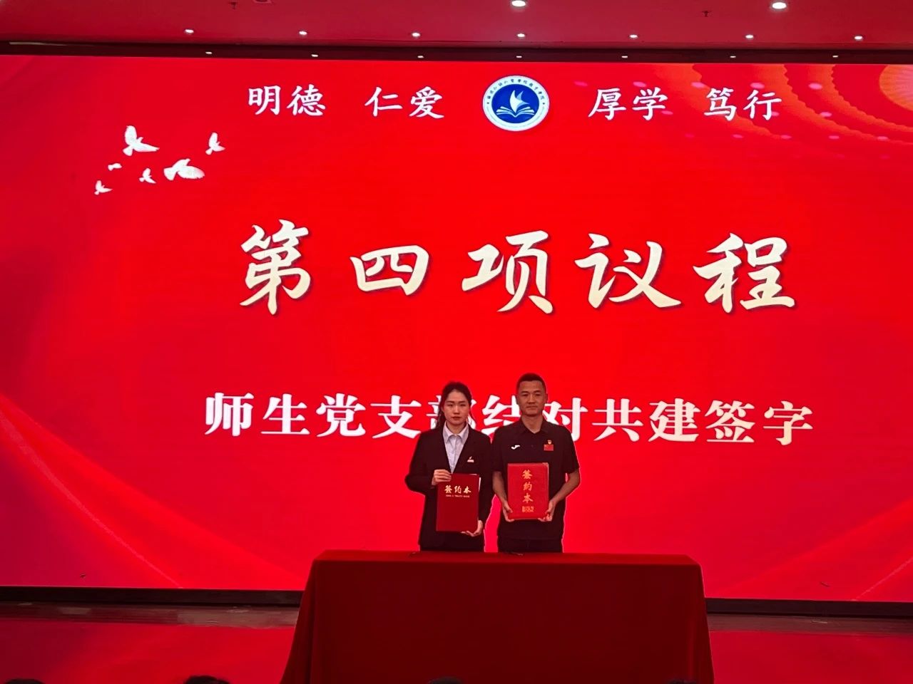 教工第一党支部书记刘舒吟老师与学生第一党支部书记刘梦泸老师进行师生党支部结对共建签字,林业铖书记为教工第一党支部与学生第一党支部师生党支部授牌。