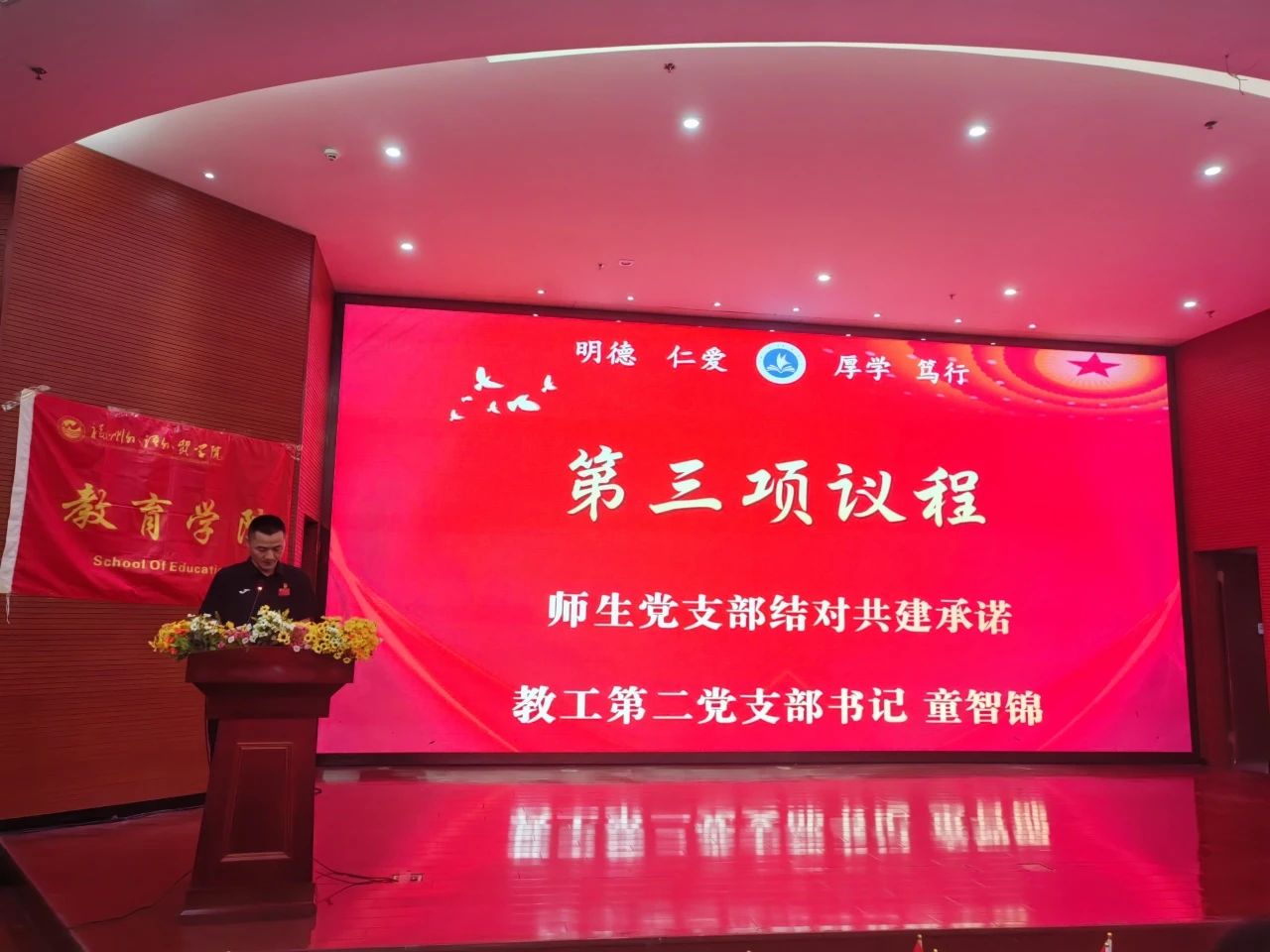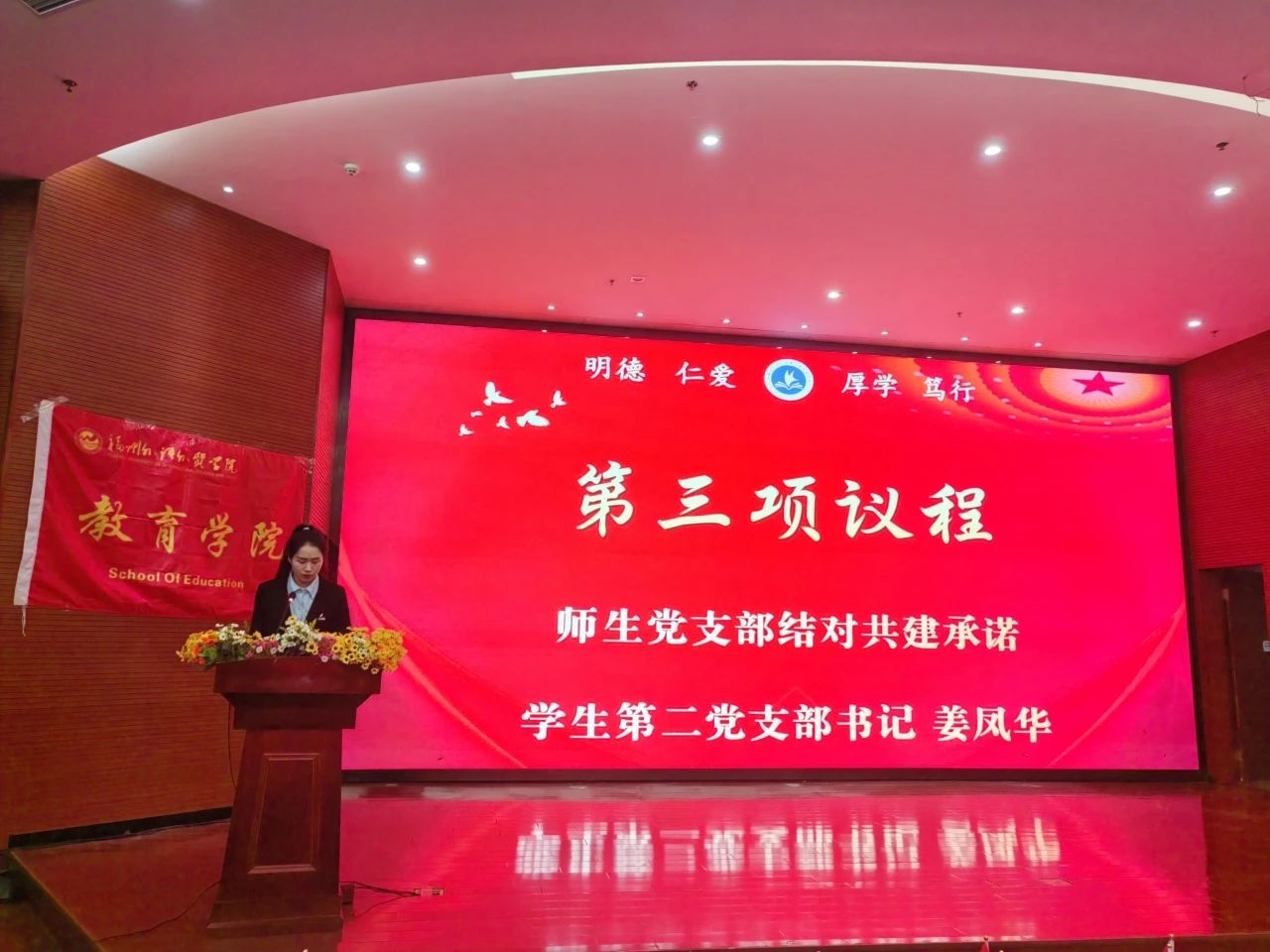由教工第二党支部书记童智锦老师和学生第二党支部书记姜凤华老师作为代表就坚定理想信念加强支部建设、深化师生交流和促进共同发展等方面作出承诺。