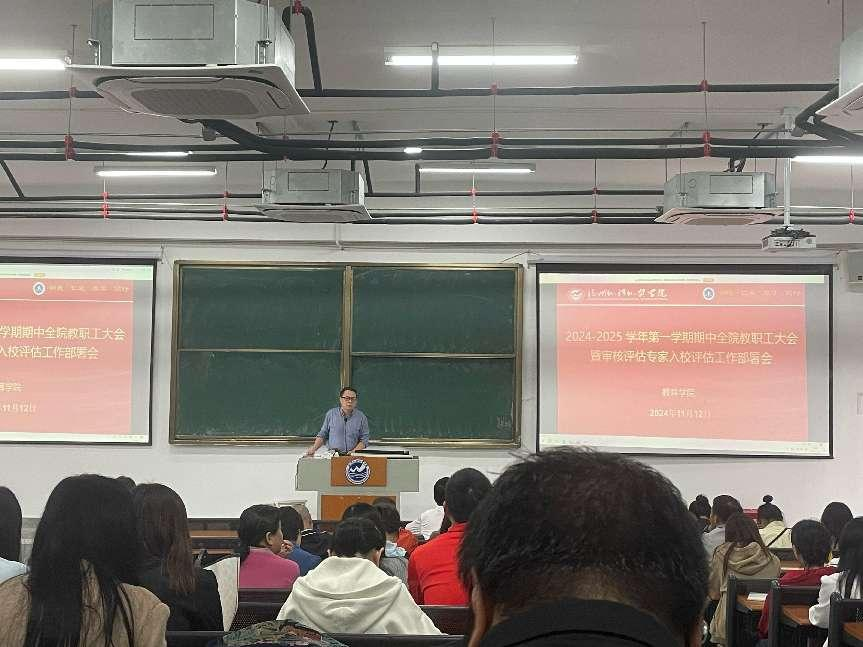 2024年11月12日,教育学院在人文3#301室召开2024-2025 学年第一学期期中全院教职工大会暨审核评估专家入校评估工作部署会,参加此次会议的有学院院长林新年教授,分党委书记、副院长陈铭帅,院长助理马小芳博士以及全体教职工。