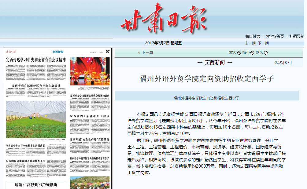 学校乐鱼网页版 乐鱼网页版办公室 第(2017)178期 中共乐鱼网页版委员会党委工作部 总第1966 2017年7月7日 甘肃日报报道:我校定向资助招...