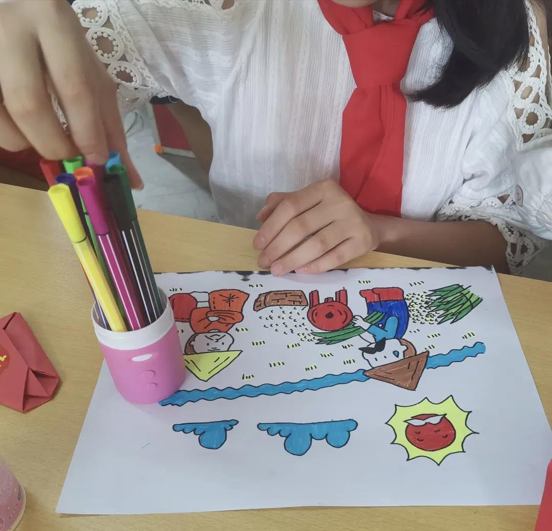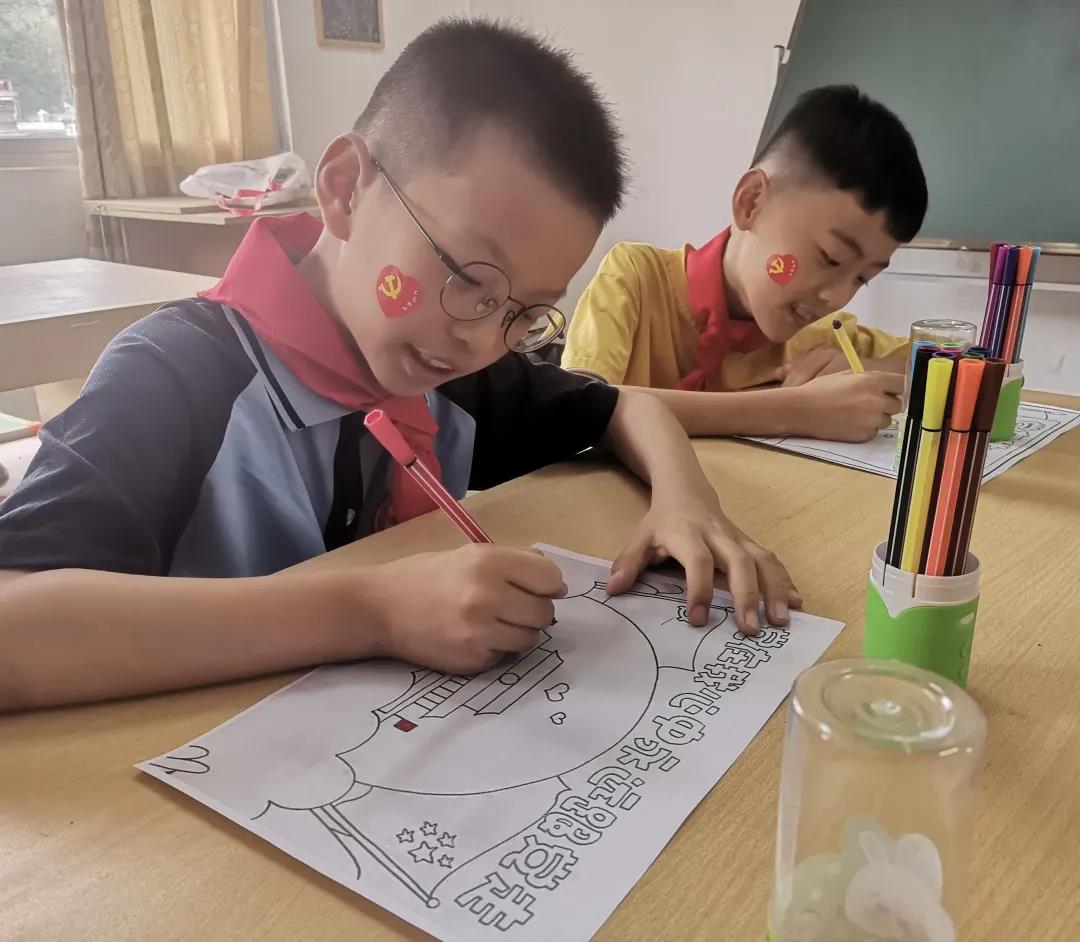 队员们为小朋友们放映红色动画,让大家细心观察,将观察到的场景用画笔画下。队员们耐心辅导,手把手指导小朋友们绘画。课程的最后,队员们邀请小朋友们上台为大家展示自己的作品。通过一幅幅生动的图画,传递出小朋友们对祖国的美好祝福、对家乡的深情赞美、对未来的无限憧憬。