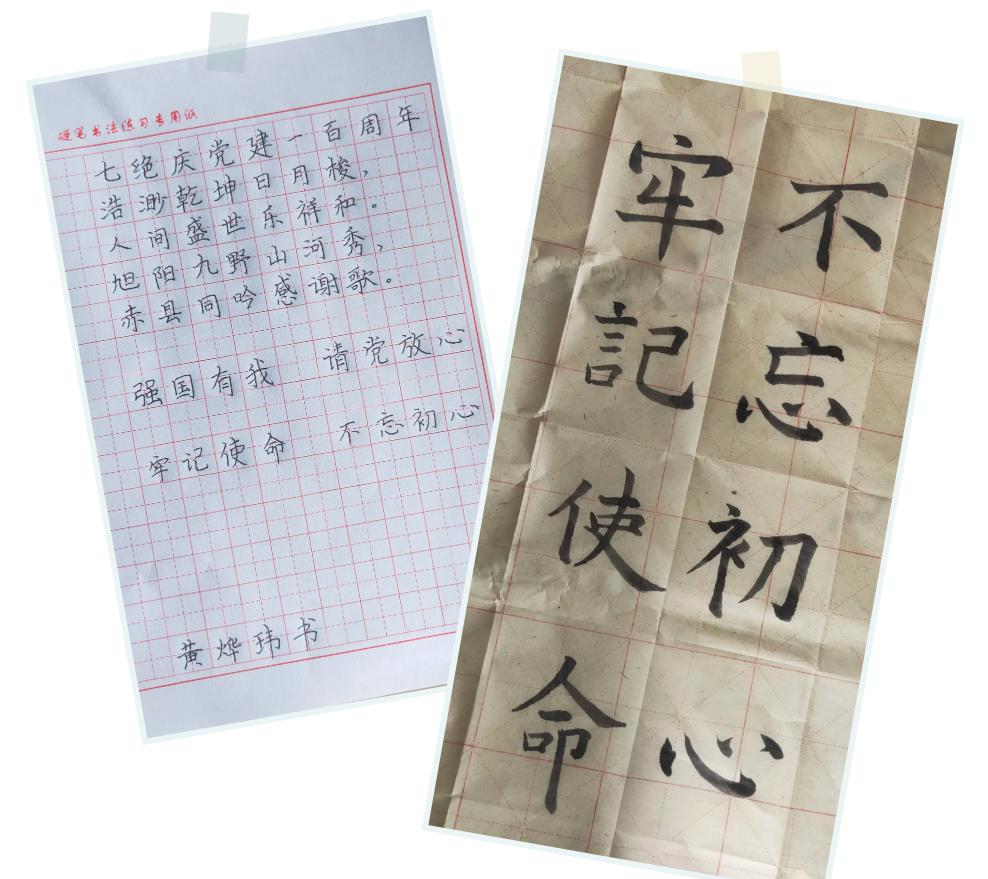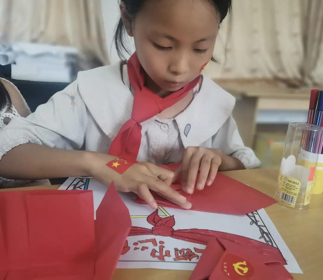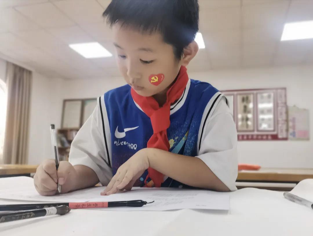 队员们用折纸折叠成各种图案,教导小朋友们亲自动手制作,通过折纸手工课培养学生的想象力和动手学习能力,接着,队员们开始教导小朋友们写书法,一笔一划都表达着小朋友对祖国有着更加深刻的认识,“强国有我,请党放心”表达了小朋友们报效国家的志向和强烈的爱国之情。孩子们在活动中不仅锻炼了动手能力,提高了审美情趣,激发了想象能力,同时也激发并强化了小朋友的爱国之情和强国之志。