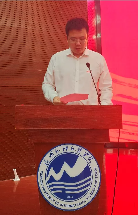 院长毕贤顺教授致辞。毕院长转达了学校董事会、学校党政领导对2021级新生的深切关爱和热烈欢迎!随后毕院长发表了新生寄语:希望你们,努力成长为一个道德高尚、勤奋学习的人。一是要树立大学学习观。大学的学习,不仅在课堂之上,也在课堂之外,在丰富的校园活动,在多彩的生活点滴,你们要扎实地学习专业知识本领,更要努力成长为满足社会需求的全面人才;二是要科学管理学习时间。相对宽松、自由的大学生活,实则对你们的学习提出了更高的要求,你们要科学、合理地分配、管理学习时间,有张有弛、劳逸结合,也要切记,学习时间不能压缩、学习任务不能拖延、学习计划不能中断;三是要掌握学习方法。要善于思考、主动学习,关注新知识、新观念的理解与运用,找到适合自己的学习方法,把学习当作一种习惯、一种精神需要、一种生活方式。希望你们,努力成长为一个追求真知、勇于创新的人。大学光阴,虽然短暂,却会为你留下终身难忘的记忆。请你们珍惜校园时光,用知识和智慧照亮前程,用辛勤和汗水回报父母。未来的岁月,我们互相勉励、共同成长!一起期待丹桂飘香时,我们福外校园相见!