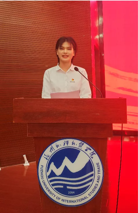 2018级建筑工程实验班李娜代表在校生发言,她分享了自己三年的大学时光,数学建模,演讲比赛,BIM毕业设计创新大赛,“挑战杯”、“互联网+”。从院级比赛到校级比赛直至国家级的比赛,都有李娜同学的身影,她对于自己成为现在的自己向学校的每一位老师表示感谢,感谢福外给了她自信。同时,她用“生无所息”四个字与大家共勉,激励同学们在大学期间也要好好学习,早早找准定位,不蹉跎这四年青葱岁月。