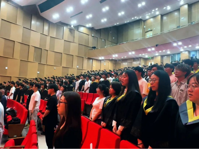 主持人宣布智能建造学院2023届毕业典礼正式开始后,毕业典礼在庄严的国歌声中开幕。
