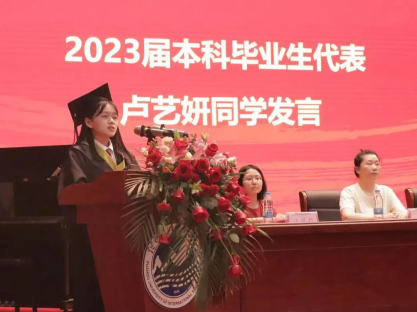 2019级工程造价专业的卢艺妍同学代表智能建造学院2023届毕业生发言,她表达了对于母校培养的感恩之情,分享了在校期间的成长经历与收获,表示会牢记“融汇中外,经世致用”的校训精神,脚踏实地、默默耕耘,不负韶华、不负期待、不负时代。