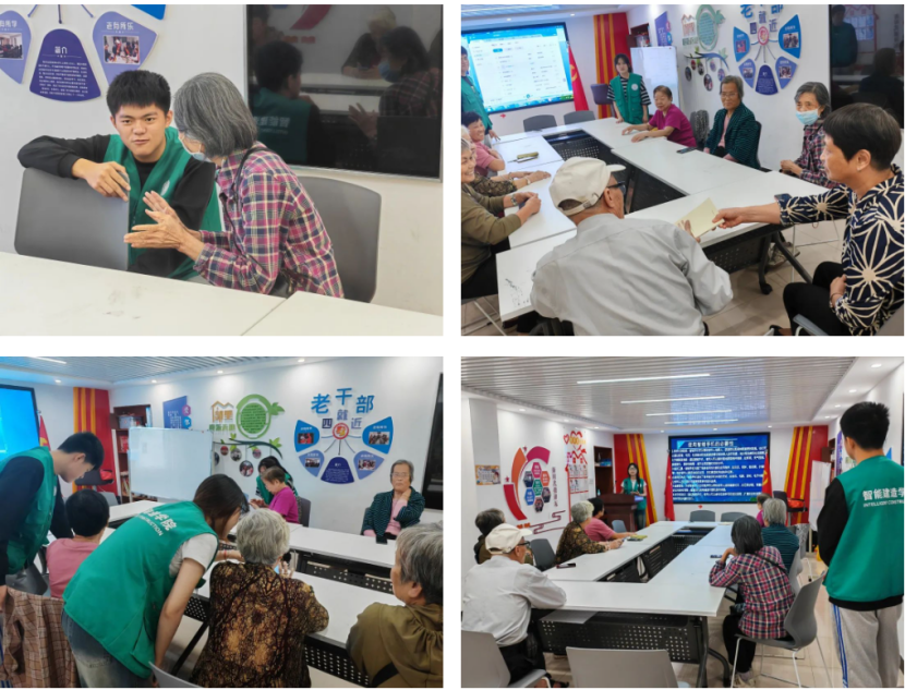 在活动开始之前,志愿者们与老人积极互动,欢声笑语,将自己的祝福于游戏传递给老人。活动以PPT的方式进行教学,包括智能手机的运用、防诈宣传等。活动讲述了新时代智能手机使用的必要性,如:保持社交联系、方便获取信息、娱乐休闲、健康管理、学习培训等。又将防诈分为电信诈骗、贷款诈骗、赌博诈骗、网络诈骗四个部分进行宣读。再由志愿者进行一对一教学,保证教学的有效性、趣味性。