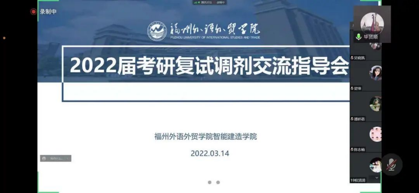 紧接着,毕贤顺院长就各位同学的情况进行细致的分析和指导,从大方向上为考研学生提供建议,与每位参会的考研同学一一连麦沟通,细致的回答同学们的问题,整个会议在气氛浓厚的探讨中进行。在会议的最后毕贤顺院长强调,考研竞争激烈,每位同学都应该做好两手准备,做好一二选择,有备无患!积极收集信息,认真准备应对,无悔奋斗时光!智能建造学院永远是各位考研学子的坚强后盾!