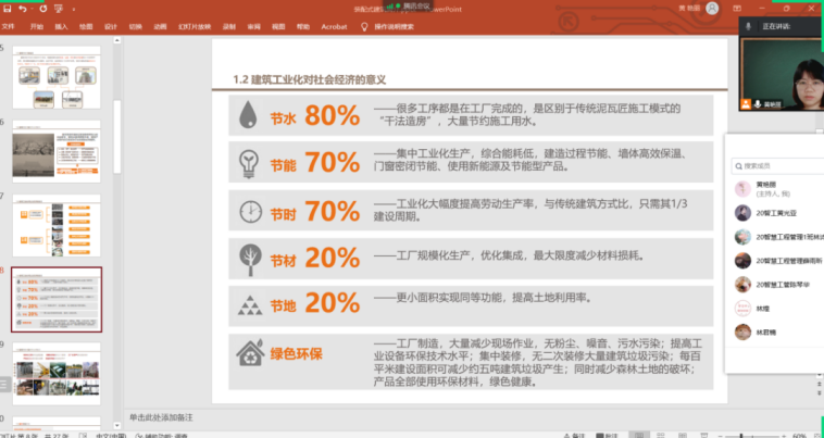 黄老师首先通过建筑装配式的定义和对社会的意义,让同学们认识到建筑产业现代化已经成为行业发展的必然趋势。装配式建筑把传统建造方式中的大量现场作业工作转移到工厂进行,采用标准化设计、工厂化生产、装配化施工、信息化管理、智能化应用,是实现建筑产品节能、环保、全周期价值最大化可持续发展的新型建筑生产方式,其建筑特点能大幅度规避了建筑废弃物出现,具有明显的节能减排优势。建筑工业化对社会经济的意义主要有: