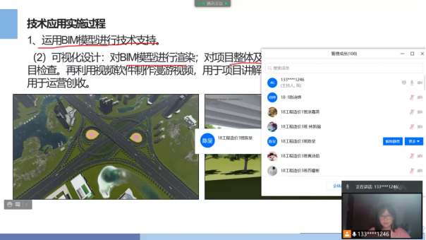 林琪燕老师在讲座中以省道S374线霞山百蓬至麻章田寮村段改建工程(湛江大道)PPP项目为案例,主要介绍该项目的信息化建设的过程,一是组织创新一是组织创新,设立项目级信息化实施小组,深入一线直击管理痛点;二是规模创新,实行“1+N”管理模式。即利用“智慧工地平台+多种模块”来对项目生产、内业、质量、安全、成本、环保等进行全方位管理;三是实施创新,实事求是开展信息化应用,传统管理与信息化管理双线并行,既不发生管理危机,又能看到管理增效;四是培训创新。最后她组织大家对信息化建设的智慧工地的造价管理展开讨论。