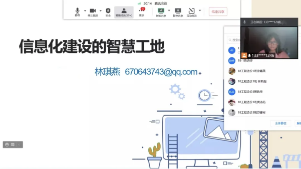 2021年10月08日,智能建造学院林琪燕老师在腾讯平台为工程造价专业学生开展一场主题为《信息化建设的智慧工地分享》专题讲座。