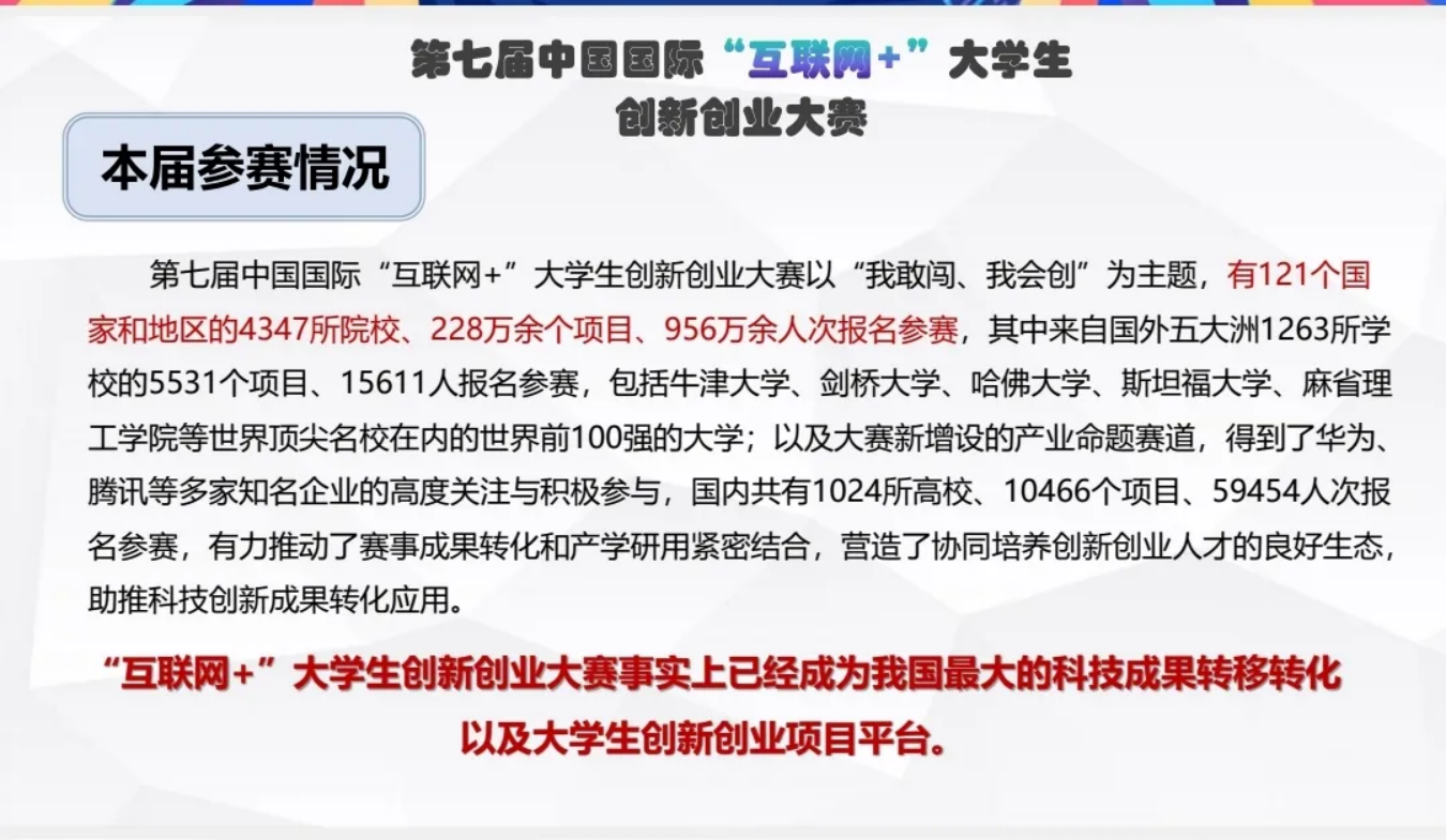 第七届中国国际“互联网+”大学生创新创业大赛“以“我敢闯、我会创”为题,目前受国内各大知名企业关注,有效推动创新创业人才的良好发展