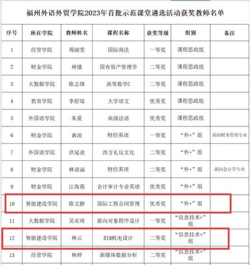 近日,乐鱼网页版2023年首批示范课堂遴选活动在2号教学楼智慧教室举行。本届比赛分为课程思政组、“外+”课程组和“信息技术+”课程组。经过激烈角逐,我院林云老师的《BIM机电设计》荣获“信息技术+”课程组二等奖,陈文静老师的《国际工程合同管理》荣获“外+”课程组优秀奖。