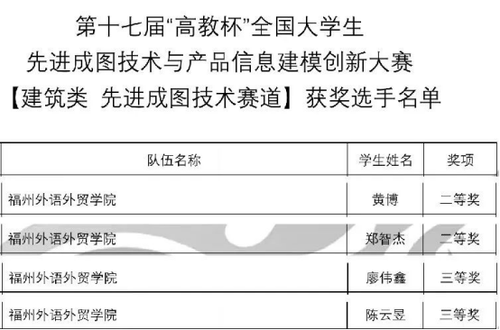 我校建筑类先进成图技术赛道参赛队伍由智能建造学院教师黄艳丽、方伟国指导,获得二等奖2项,三等奖2项;团队赛由黄艳丽、方伟国、吴繁超、黎小英指导,获得了三等奖1项,取得了突破性的好成绩,创造了新的辉煌!