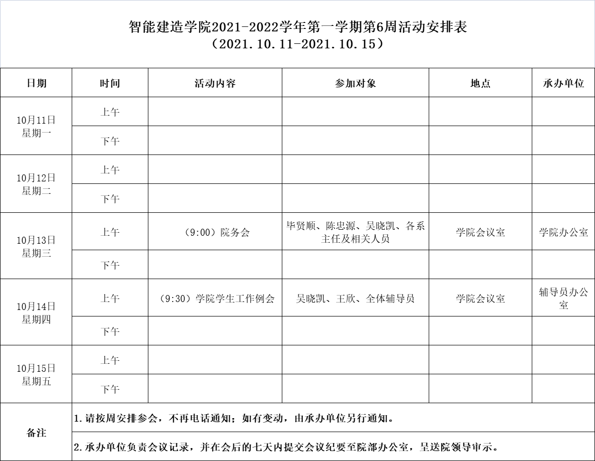 智能建造学院2021-2022学年第一学期第6周活动安排表
