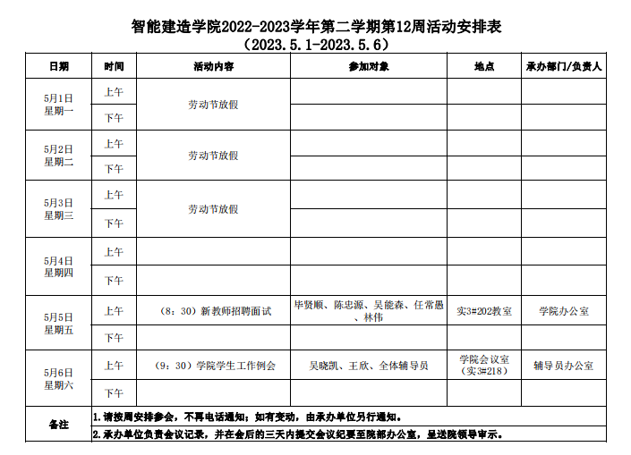 智能建造学院2022-2023学年第二学期第12周活动安排表
