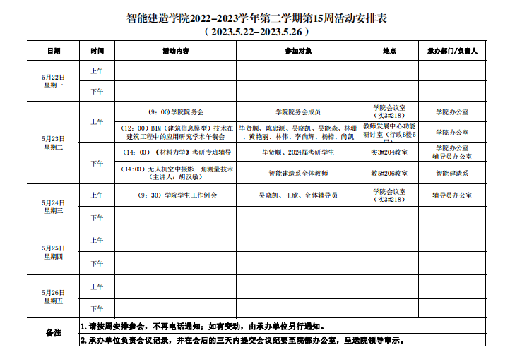 智能建造学院2022-2023学年第二学期第15周活动安排表
