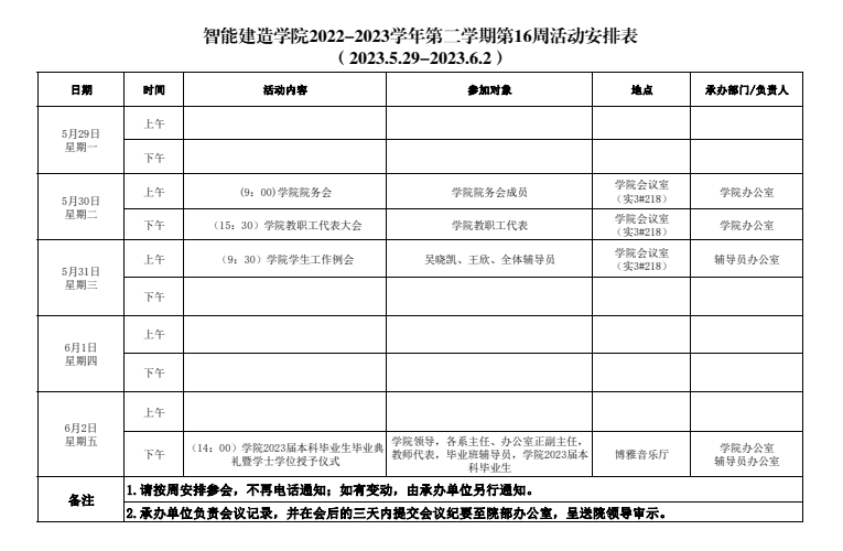 智能建造学院2022-2023学年第二学期第16周活动安排表