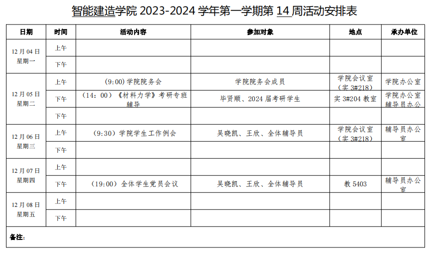 智能建造学院2023-2024学年第一学期第14周活动安排表