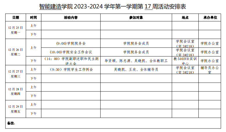 智能建造学院2023-2024学年第一学期第17周活动安排表