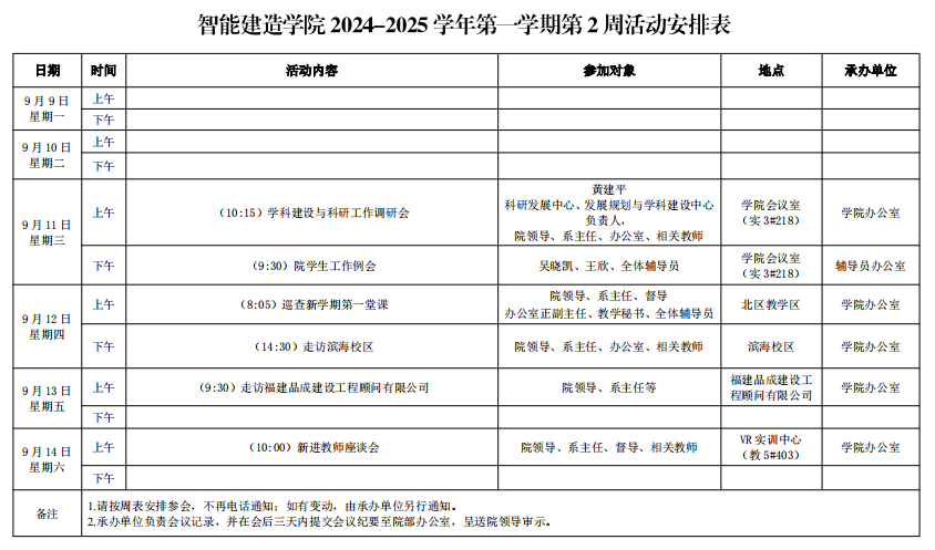 智能建造学院2024-2025学年第一学期第2周活动安排表
