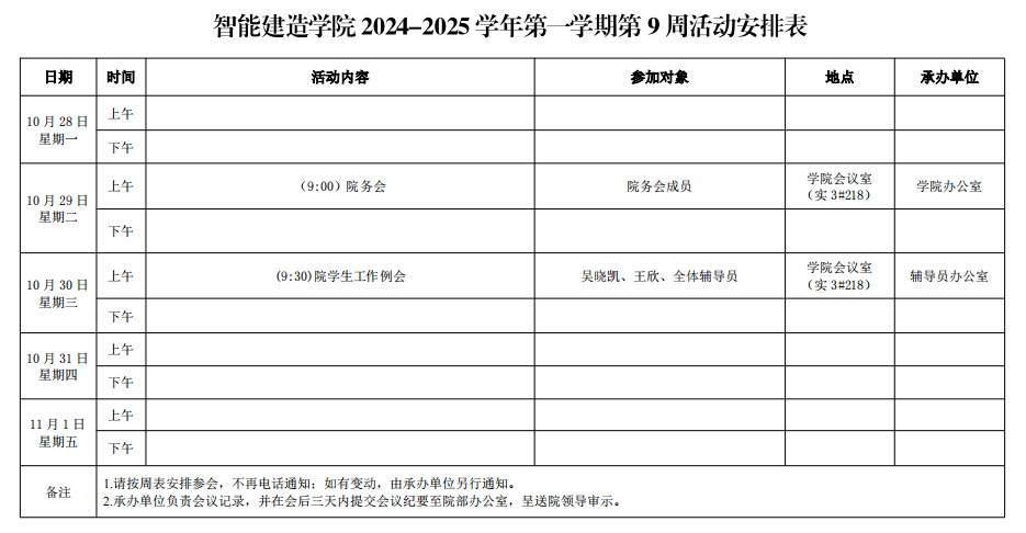 智能建造学院2024-2025学院第一学期第9周活动安排表