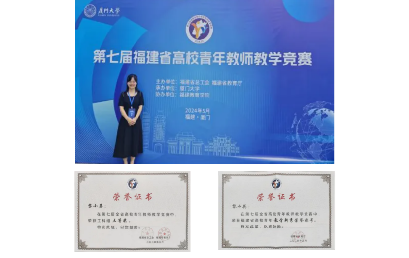 任教期间,她多次在各类教师教学竞赛、教改项目中取得佳绩,获得福建省第七届高校青年教师教学竞赛工科组三等奖、校级青年教师教学竞赛大赛二等奖、2020年获福建省民办教育协会“云上风景”优质网络在线课程优秀奖、2019年获校级首届教学改革研讨会校级优秀论文荣誉,并荣获福建省高校青年教学新秀、校级教学之星、校长嘉奖令等多项荣誉。